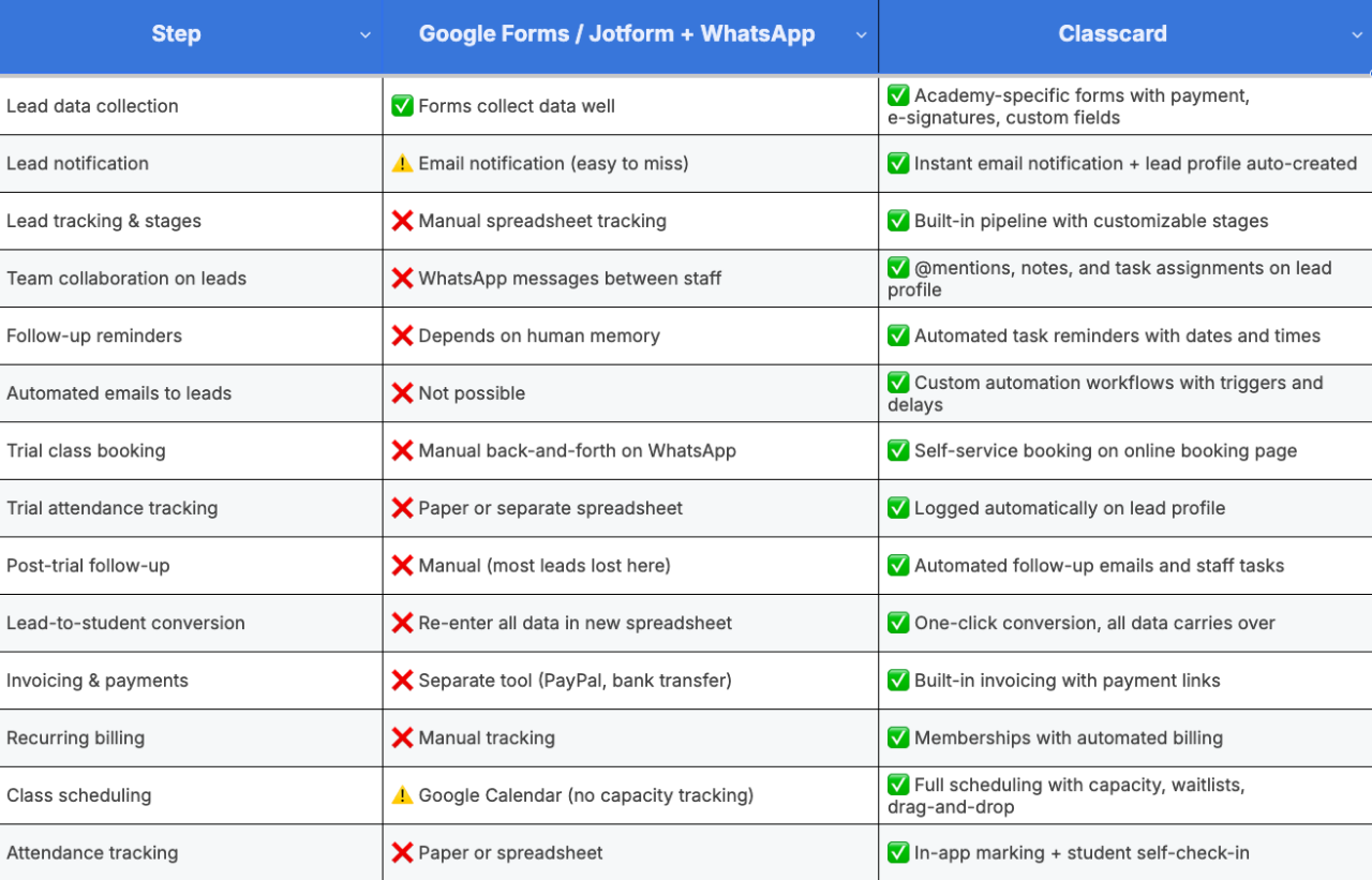 The pattern is clear: Google Forms and Jotform handle step one - data collection - reasonably well. But they were never designed to handle steps two through ten. Those steps are where the real operational work of running an academy lives, and they're exactly where the manual approach falls apart.
